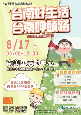 為打造黃偉哲市長「希望家園」的施政願景,勞工局今(113)年第3場「台南好生活 台南呷頭路」中型徵才活動將於8月17日(週六)上午9時至12時在中西區南美里活動中心辦理,有艾爾斯半導體、前瞻能源科技、台灣穗高科技、瓜瓜園企業、奇美食品、和明紡織、好帝一食品(牛頭牌)、三商餐飲、統一超商、安心食品(摩斯漢堡)、春水堂實業、新光三越百貨、DHL台灣敦豪供應鏈等26家廠商,提供1,410個工作機會,月薪達3萬元以上的職缺有7成。