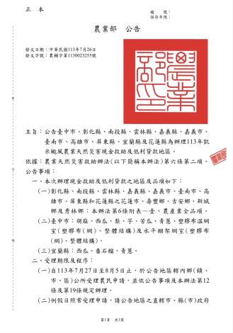農業局長李建裕表示,此次公告為農產業全品項現金救助,符合資格的農民請於7月27日至8月5日止,向土地所在地公所提出申請,申辦時請攜帶「身分證、印章、存款簿、土地所有權狀(或土地登記簿謄本)」,若是承租土地必須檢附有效期間內的「土地委託經營或租賃契約書」。如最近一年(含本年度)有通過產銷履歷驗證、申請農業相關保險或參加綠色環境給付計畫領有給付者,請一併提供相關證明文件。此外,農民可使用農業部開發「農產業天然災害現地照相」APP拍照上傳田區災損情形,各區公所可據以認定並免除現地勘查,加速救助審查流程。