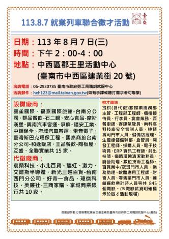 為打造黃偉哲市長「希望家園」的施政願景,勞工局積極辦理各項就業徵才活動,並因應產業求才需求,勞工局職訓就服中心113年8月7日(週三)下午2時至4時在中西區郡王里活動中心(臺南市中西區建業街20號)辦理『113.8.7就業列車聯合徵才活動』,邀請25家廠商提供845個職缺,歡迎求職民眾踴躍前往參加,洽詢電話:06-2930785。