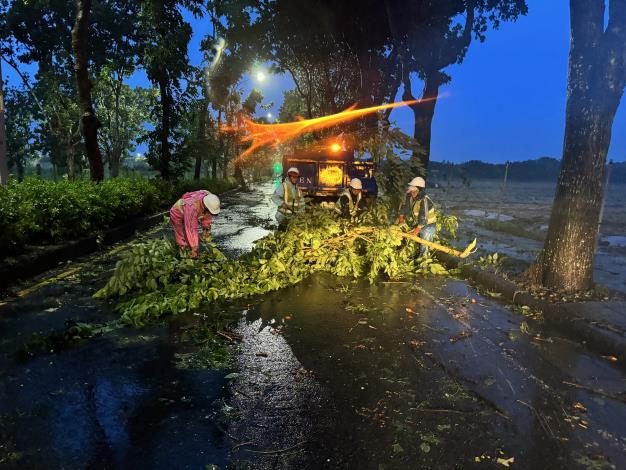 颱風期間工務局全力動員分成29組人力處理颱風路樹倒伏、道路修補及排除障礙、路燈及廣告物等搶救,因凱米颱風風強雨大,致災狀況仍不斷發生,工務局儘力修復各種災情,預計今晚12點前,全部處理完成,讓臺南市的道路恢復暢通,以維護市民安全。
