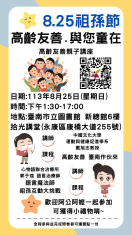 為了喚起各界對於敬老的重視,臺南市政府衛生局持續推動高齡友善社區計畫,結合8月的第4個禮拜日「祖父母節」辦理「高齡友善親子講座」,增進祖孫相處時光,向大人、小孩推廣高齡友善的概念,提升社區民眾健康識能,營造高齡友善環境。此外,透過講座也提升家人對於孩童在每一成長階段的重視,提供祖孫都能獲得最適當的照護環境,理解長者同時學習如何及時注意家中小朋友們的狀況,以培養增進親子關係。