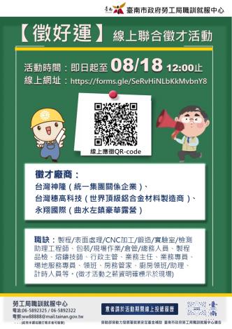 為打造黃偉哲市長「希望家園」的施政願景,勞工局積極辦理各項就業徵才活動,並因應產業求才需求,勞工局職訓就服中心即日起至113年08月18日12:00止辦理【徵好運】線上聯合徵才活動,邀請3家廠商提供逾256個職缺,歡迎求職民眾踴躍線上應徵投遞履歷,洽詢電話: 06-5892325。