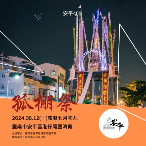安平區孤棚祭是安平區特有農曆七月普渡儀式,至今已傳承百餘年,並在2016年受登錄為臺南市無形文化資產。儀式由安平港仔尾靈濟殿每年農曆七月初九舉辦,今年度訂於113年8月12日(一)舉辦。有別於其他地區搶孤活動,孤棚祭以五根約七至八公尺高的圓柱搭起棚面並擺放案桌,四邊圓柱各懸掛一隻冷凍大豬公,再由案桌前降下白布,一直延伸至運河水中,以此作為魂路接引「老大公」與水中孤魂前來接受普渡。棚上的「篙串」則綁上各種雜糧祭品,高掛篙串為的是讓遠方孤魂也能看得見,前來接受普渡。特殊的孤棚外觀及祭典方式,成為全國唯一的靜態祭祀活動,今年靈濟殿持續舉辦綁篙餞DIY體驗活動,歡迎民眾一起共同參與。